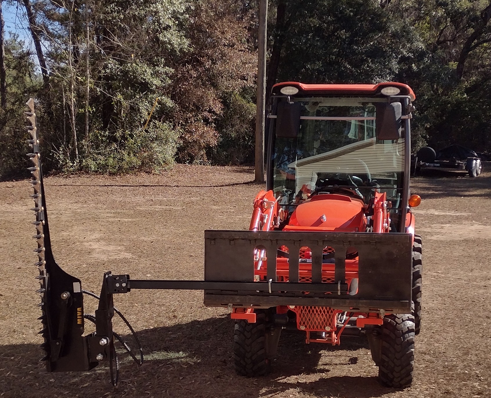 I did consider the weight hanging off one side. I weighed it and it only weighs 132 lbs even with the fabricated mount. What I forgot to consider is I run my tire pressures low for comfort and I didn't increase the pressure for this. The RF bead came off the rim when I tried to turn left away from the work. I had to put jack stands under the loader to lift it and pump the tire back up but the bead reseated easy.