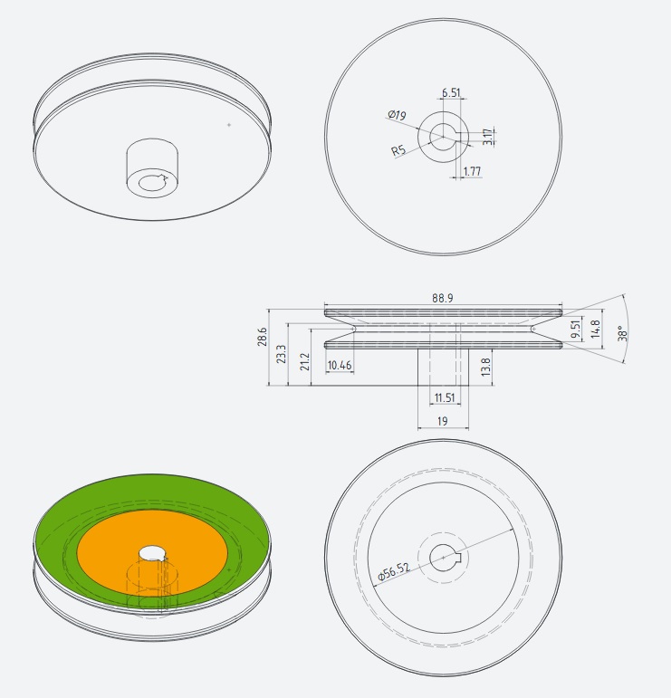 I've been giving the 3D printing concept more thought. The problem with printing a V-belt is it would need to be printed horizontally, so the belt would be wedging the layer adhesion -- the weakest point of 3D printing even using CF reinforced nylon filament. We were making cogged pulleys and the forces are across the layer lines so this is apples to oranges. It might still be fun to try, but I would redesign things a bit, making the top of the pulley flat with a recess for the nut and washer to better distribute the delaminating force.